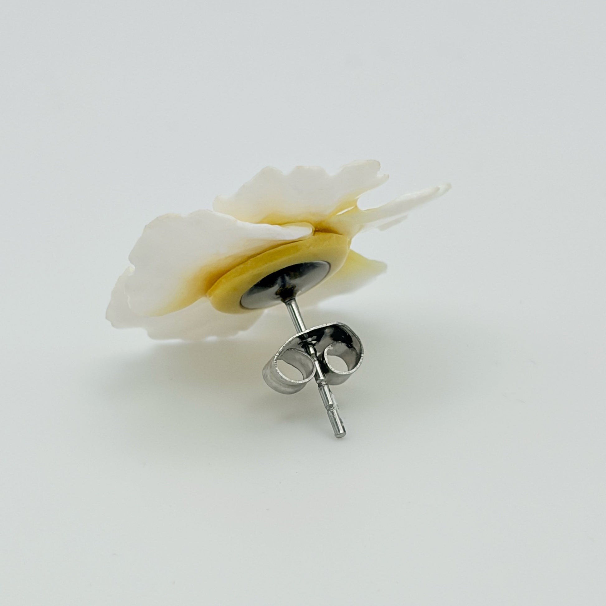 Coppia orecchini FIORE DI MULAN, PETIT - GIALLO realizzati con la tecnica degradè ,in argilla polimerica e punti luce argentati, componenti in acciaio inossidabile 316L con chiusura a lobo centrale e farfallina