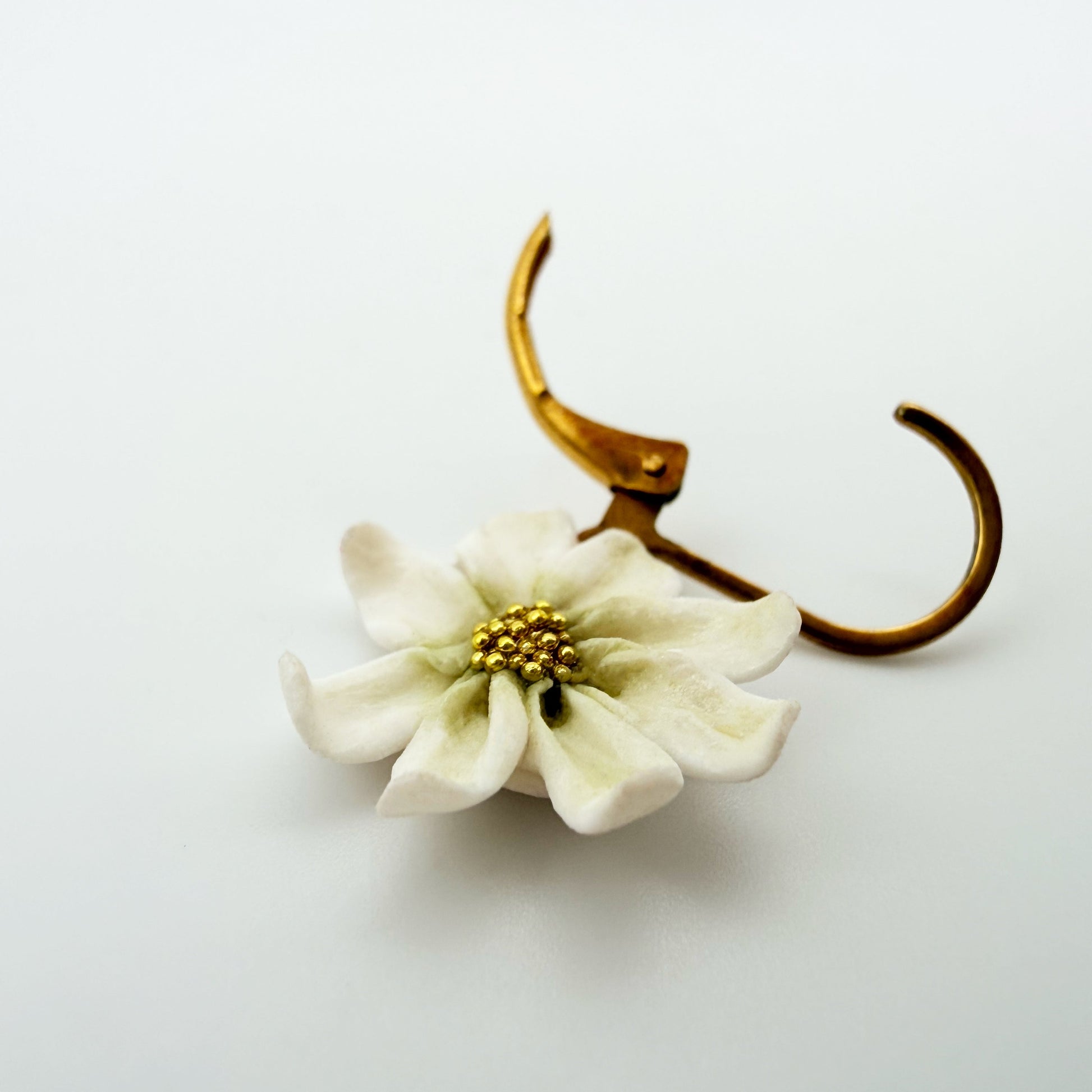 Coppia orecchini MARGHERITA, MINI - HOOP - Bianco, realizzati con la tecnica degradè, in argilla polimerica, componenti: al centro del fiore - micro sfere dorate in acciaio inossidabile 316L e chiusura a lobo con HOOP dorato