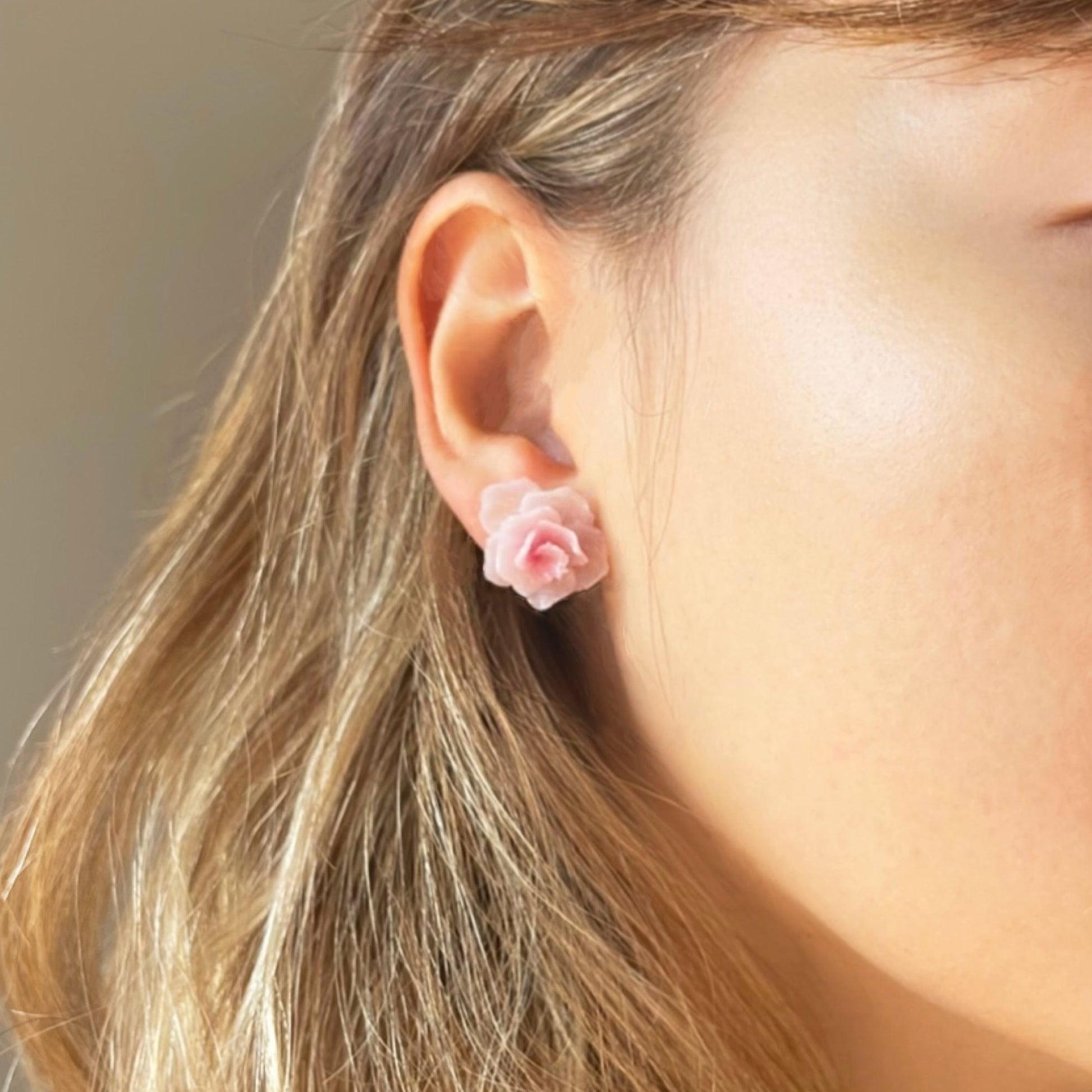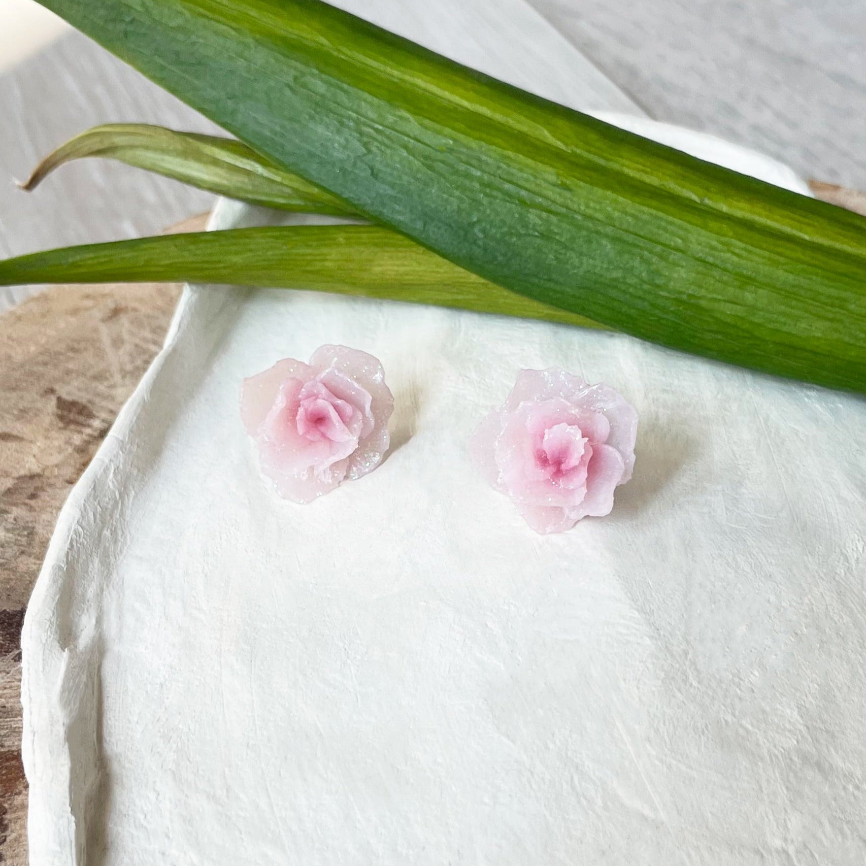 Coppia orecchini MINI Peony, Rosa , in argilla polimerica semitrasparente, chiusura in acciaio 316, argentato e a lobo con farfallina
