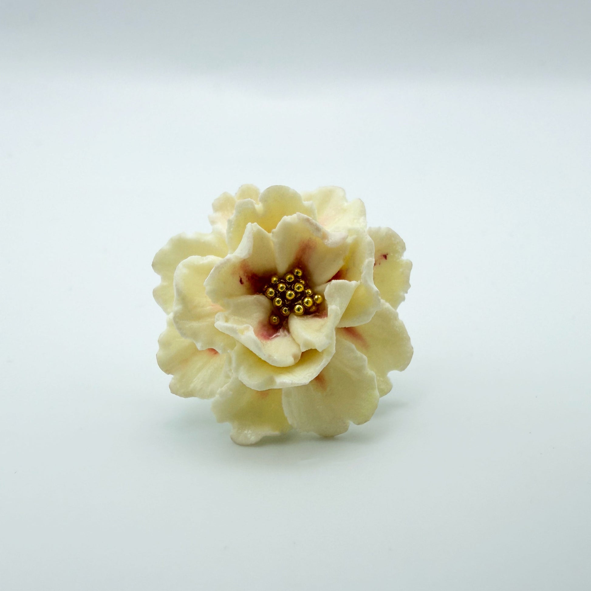 Coppia orecchini PEONY, PETIT - Burro, realizzati in argilla polimerica e dipinti a mano con venature di colore rosa, al centro: punti luce di micro sfere dorate, componenti in acciaio inossidabile 316L con chiusura a lobo centrale e farfallina
